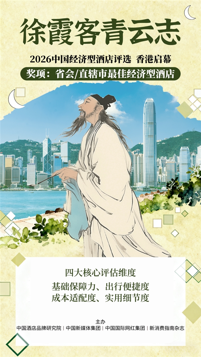 当徐霞客“探索天地”的旅行精神跨越六百年,与当代出行者“求高性价比、享实用舒适栖居”的核心需求共振,一场重新定义城市经济型住宿标准的行业盛会,近日在“亚洲文旅枢纽”香港正式启动。“徐霞客青云志——2026中国经济型酒店评选”作为中国文旅卓越大奖核心板块,由中国酒店品牌研究院、中国新媒体集团、中国国际网红集团、新消费指南等四大权威机构联合主办、上海秀维文化传媒全程承办,11月15日至12月15日为评选周期,2026年1月初拟举办颁奖盛典,并创新增设“省会/直辖市最佳经济型酒店”席位,以“专业评审+大众口碑”双轮驱动,为千万出行者筛选真正“价优、实用、够省心”的住宿标杆。